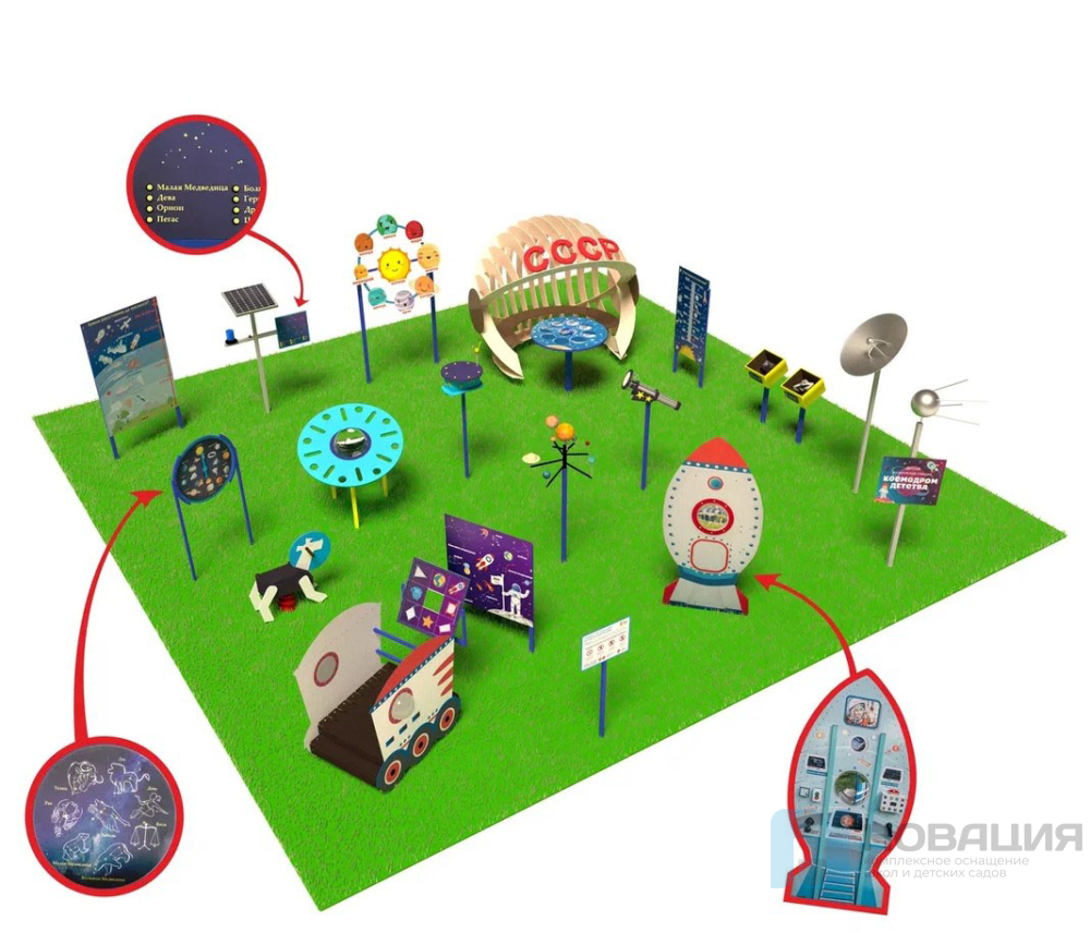 Макеты помогают узнать об устройстве Вселенной и профессии космонавта. Пособие содержит рекомендации по работе с приборами. Площадка подготовлена к смене погодных условий и частой эксплуатации. Поверхности гипоаллергенны, противостоят физическим и химическим воздействиям.