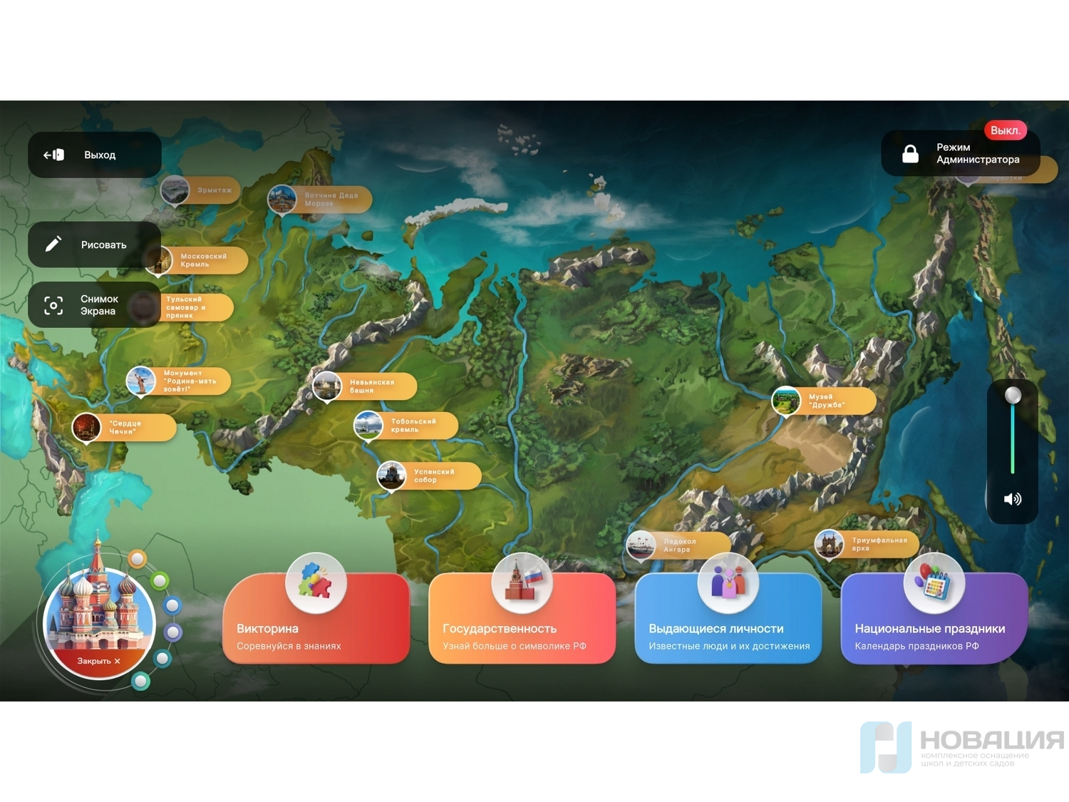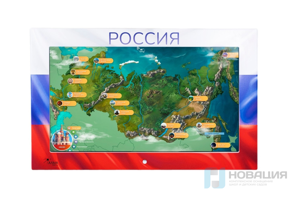 - Интерактивная настенная панель, оформленная в стилистике российского триколора. (43 дюйма, Full HD, мультитач 10 касаний);