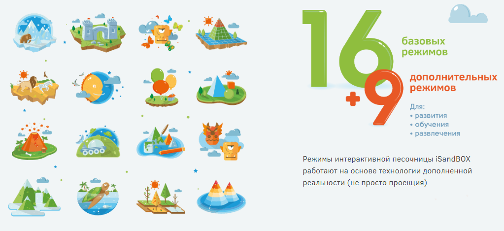 Занятия со специальным материалом предусматривают применение эффектов дополненной реальности. Обычные сооружения из промытого песка под действием эффектов превращаются в имитацию ландшафта.