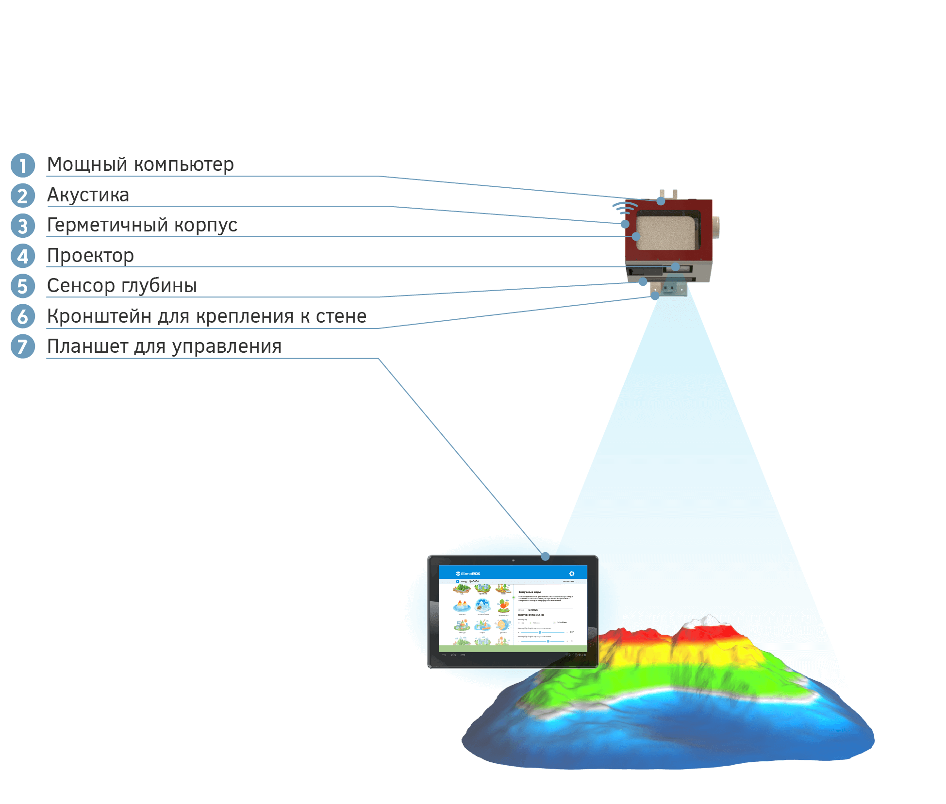 Песочница монтируется к стене, подключается к вентиляционной системе. Занятия с песком проходят в безопасных условиях, предусматривается оптимальное освещение рабочего поля. Промытый материал после применения технических эффектов превращается в имитацию природного ландшафта: рек, гор, дюн.