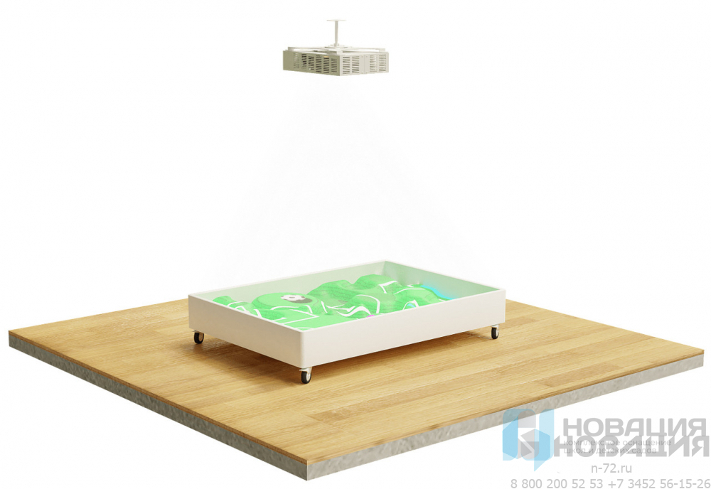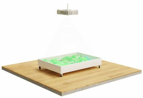 Потолочная техника передает изображения на столешницу или напольное покрытие. Площадь проекции составляет 1,6 кв.м. Комплекс автоматически калибруется. Программа обновляется самостоятельно. Датчик распознавания объема реагирует на касание предметами (например, кубиками и другими фигурами). Можно построить замок, составить слова из элементов с буквами.