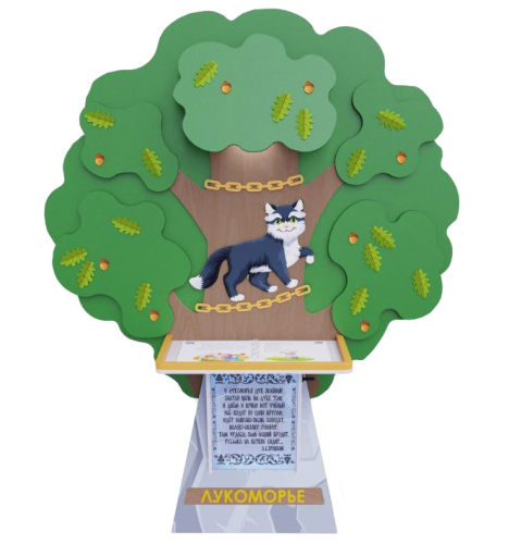 Стойка изготовлена из экологически чистых и гипоаллергенных материалов, обеспечивая безопасность и долговечность даже при активном использовании. Дизайн выполнен в виде сказочного дуба с котом, на стойке размещена знаменитая цитата из поэмы А.С. Пушкина «Руслан и Людмила»: «У лукоморья дуб зеленый...».