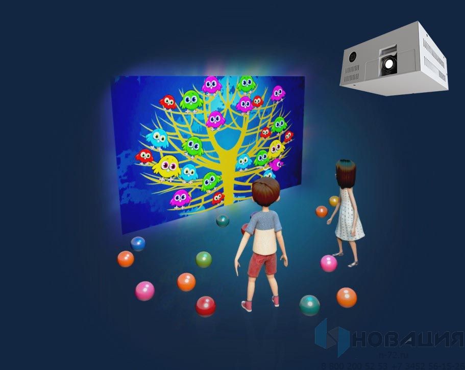 Проектор с компьютером встроены в защитный корпус, который закрепляется под потолком на высоте 2-6 м. Управление картинкой – местное беспроводное или через Wi-Fi. Благодаря цветной проекции стена превращается в игровое поле с мишенями. Датчики считывают движения ребенка, реагируют на касание предметом, броски.