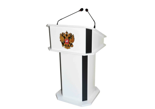 Дизайн корпуса подойдет под любой формат учебного класса или актового зала. На лицевой стороне трибуны расположен герб Российской Федерации. Сенсорный дисплей имеет операционную систему на базе Microsoft Windows - 10, а также разъемы USB и HDMI.