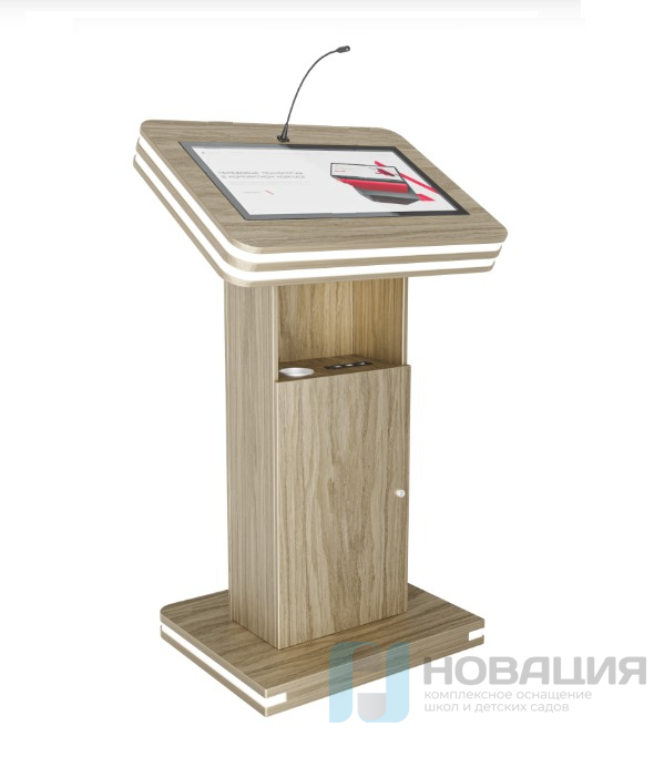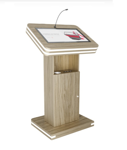 Встроенные микрофоны позволяют передавать звук на большую аудиторию. С помощью удобного интерактивного дисплея с мультитач-системой можно отображать необходимую информацию для спикера и для зрителей, передавая ее на большой экран. Также в трибуне предусмотрены полочка для воды и внешние разъемы.