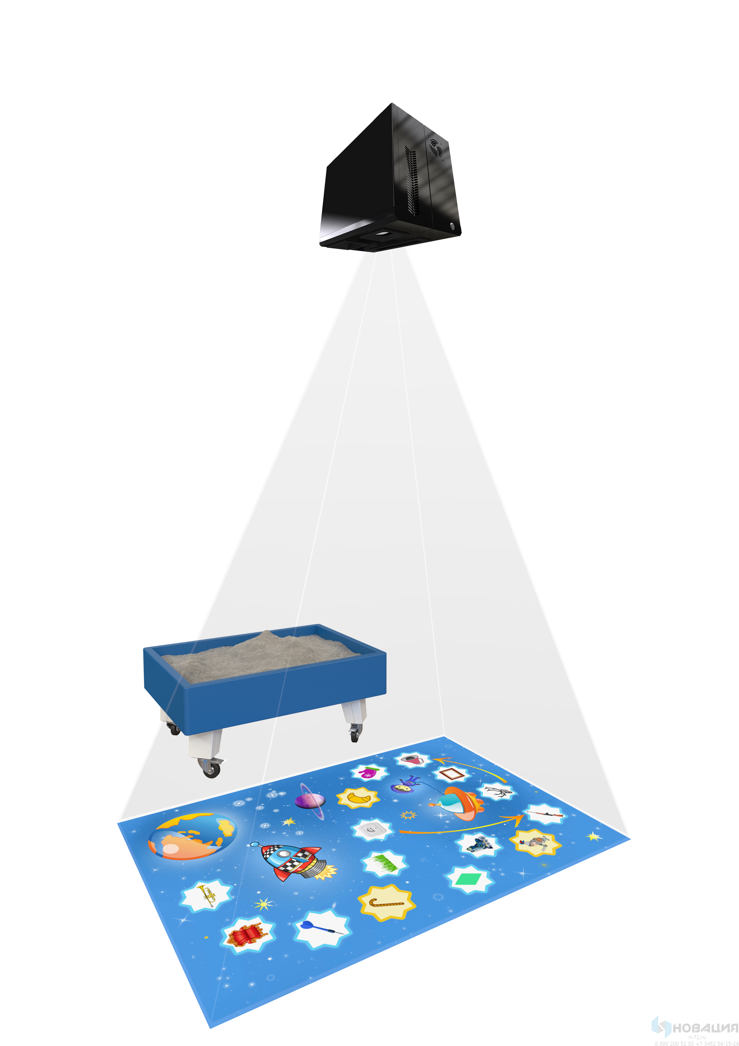 Игровой комплекс из песочницы и интерактивного пола размещается в ДОУ. Для установки понадобится от 2,5 кв. м свободного пространства.