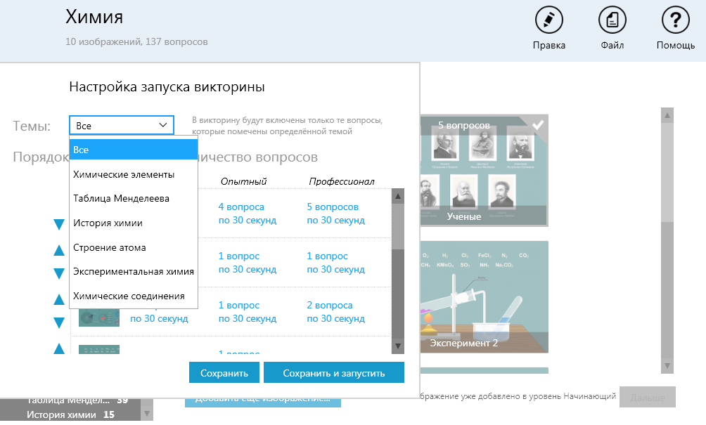 Игра-викторина содержит вопросы из разделов: строение атома, свойства химических веществ, таблица Менделеева, химические эксперименты, исторические факты.