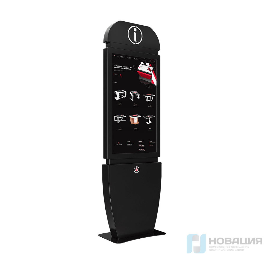 Сенсорный киоск Info оснащен утонченным корпусом, ярким дизайном и мультитач-системой. Размещенный на корпусе знак информации имеет яркую подсветку, которая позволяет заметить его издалека.