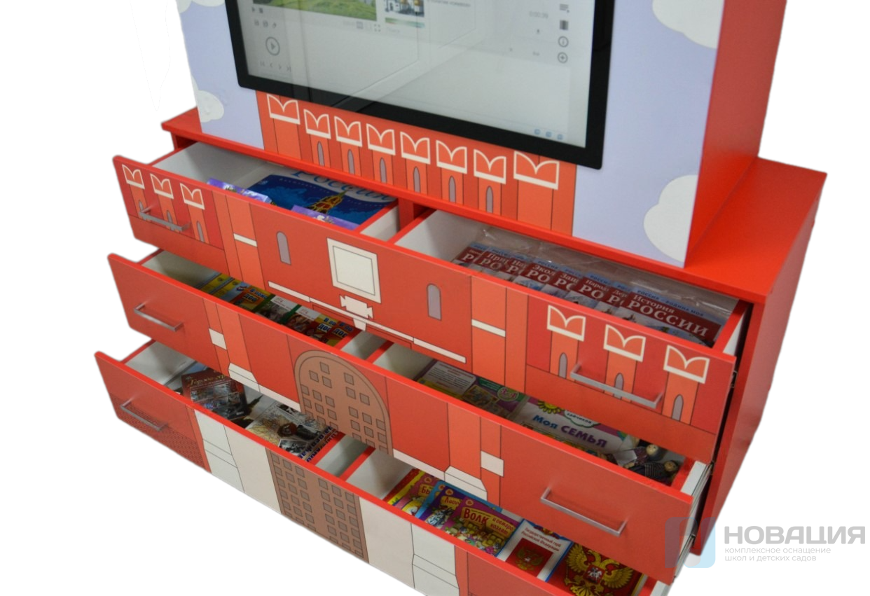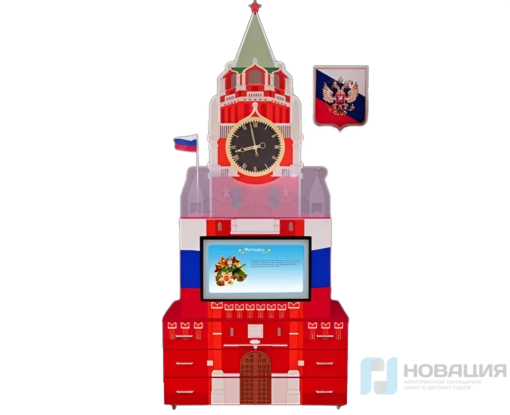 Комплекс предназначен для проведения уроков по патриотическому воспитанию. Формирует чувство патриотизма, развивает знания о стране. Корпус выполнен из ЛДСП в виде Спасской башни Кремля, имеет атрибуты государственной символики.