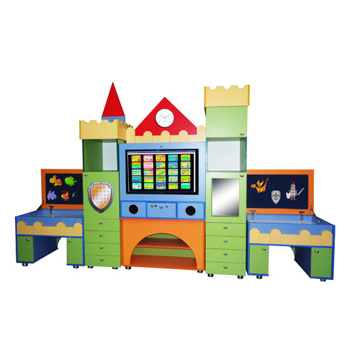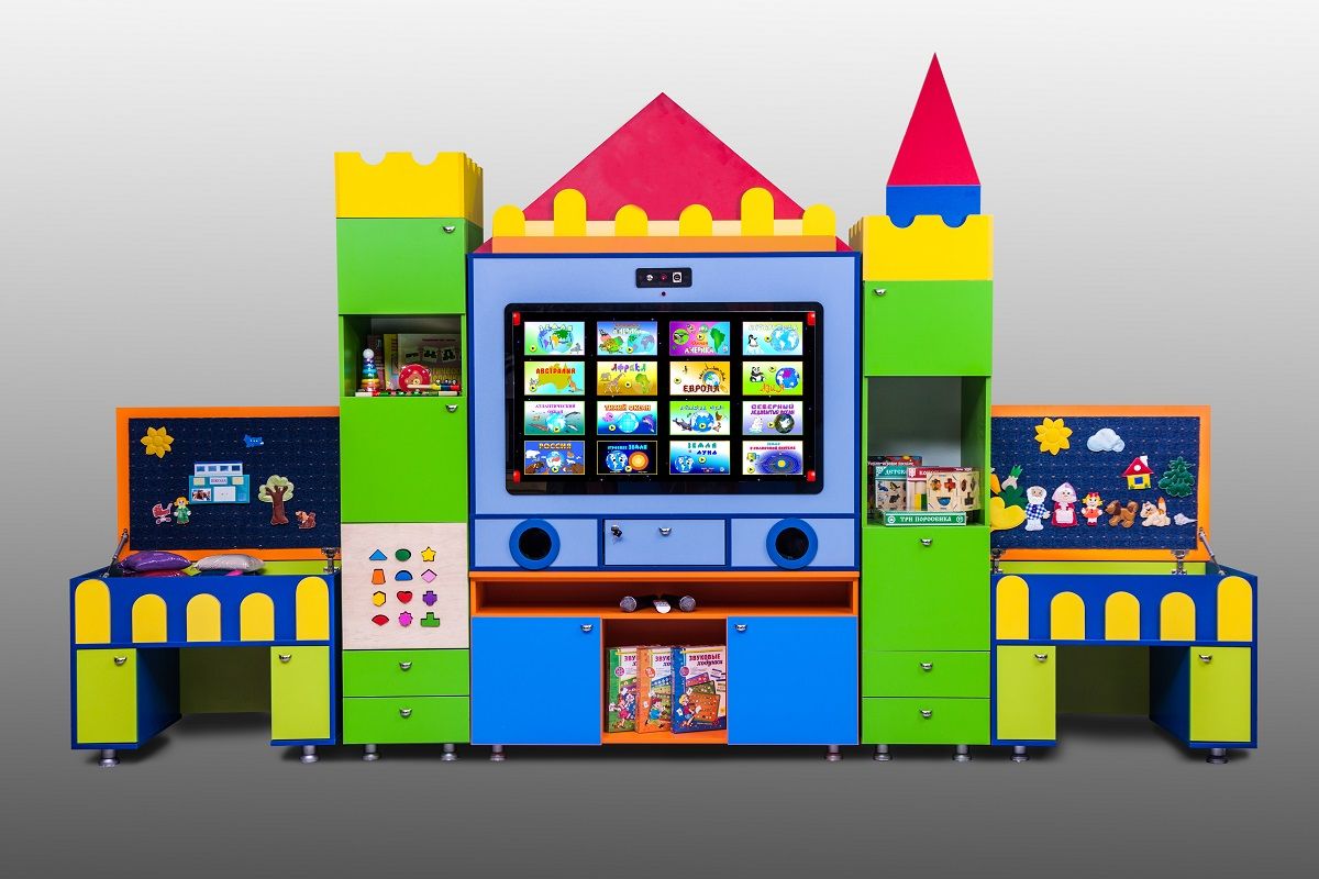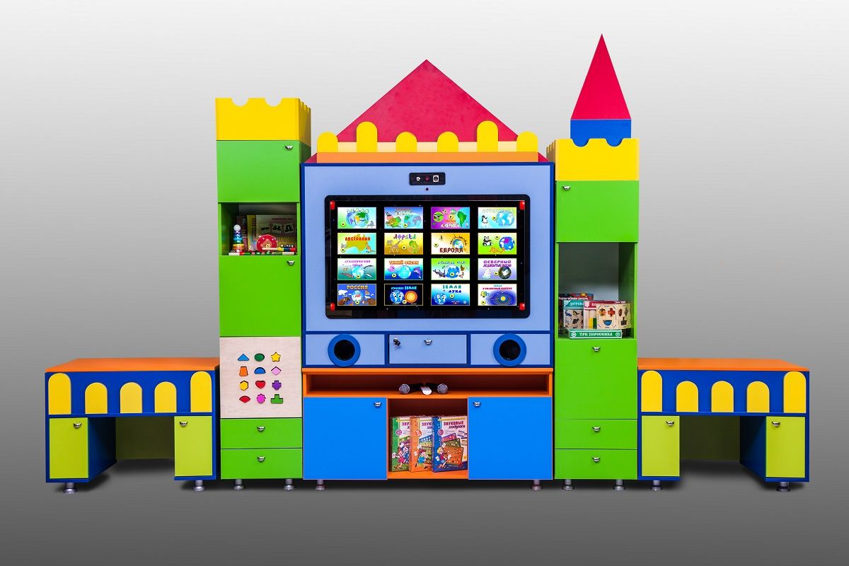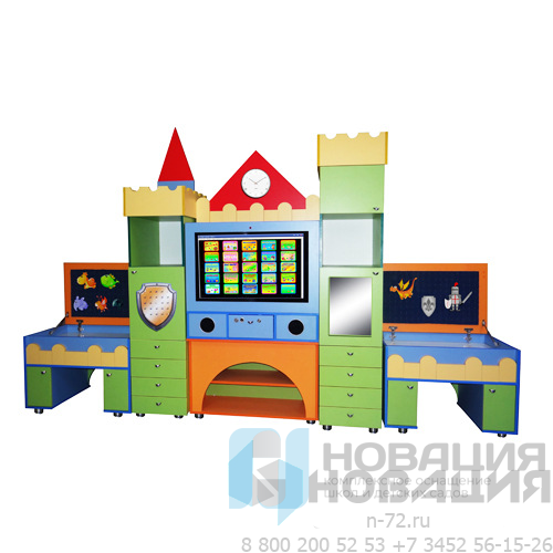 Интерактивный логопедический комплекс используется в ДОУ и школе. Служит для демонстрации готовых информационных материалов, презентаций, а также для организации выполнения упражнений, направленных на улучшение речевого развития. Декоративный корпус в виде замка оборудован выдвижными ящиками, полками и столешницами с углублениями. Откидывающиеся крышки над столешницами позволяют экономить пространство. Каждая часть «Логопедического замка» может использоваться обособленно, поэтому даже во время групповых занятий дети не мешают друг другу.