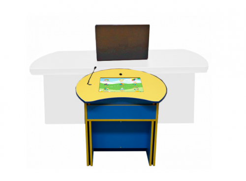 Парта с дисплеем работает бесшумно. При необходимости выполняет функцию обычной мебели. Ставится даже в тесных помещениях. Антивандальный монитор защищен крышкой-столешницей.