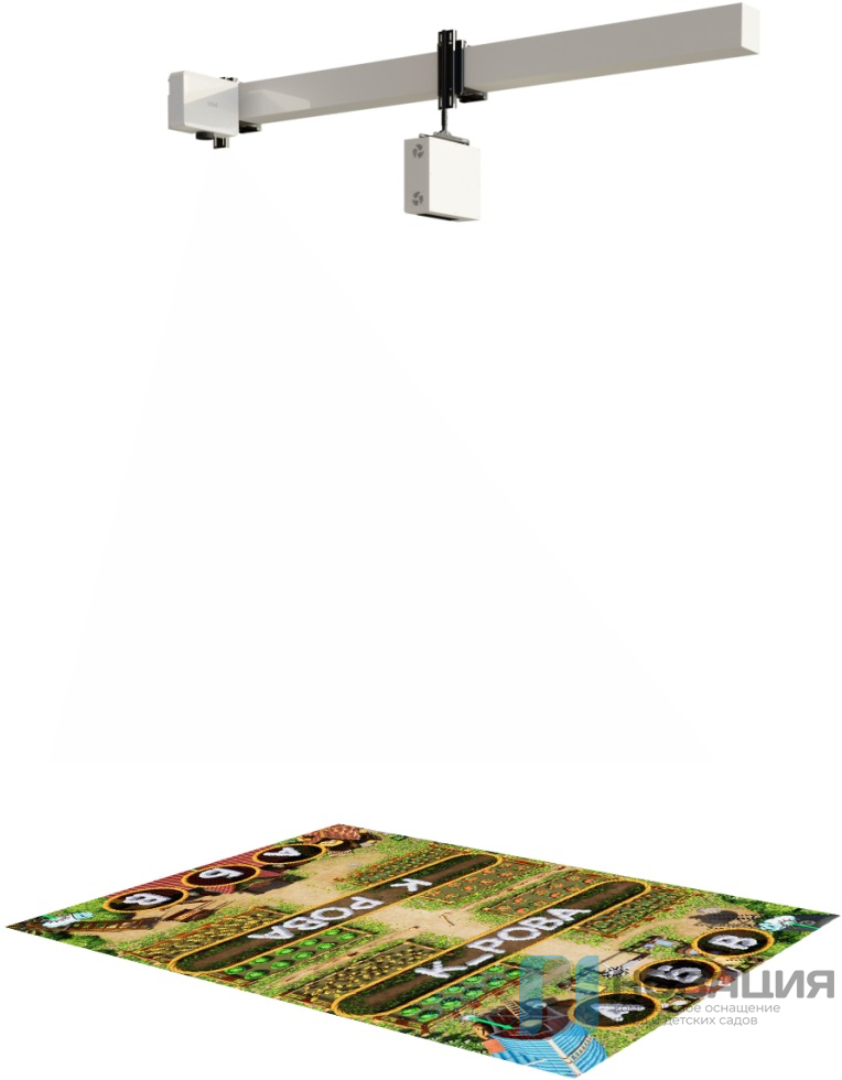 Проектор и датчик с компьютером крепятся отдельно к потолку посредством кронштейнов. Управление осуществляется при помощи планшета.