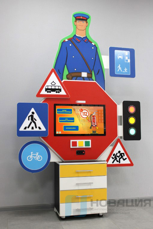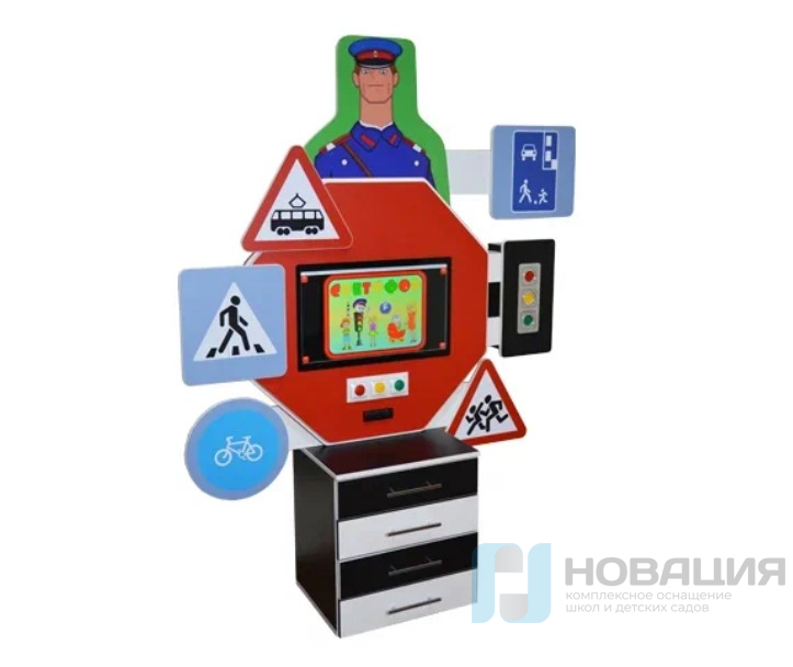 Рекомендован для использования в дошкольных учебных заведениях, школах, специальных образовательных центрах, кабинетах ОБЖ. Корпус выполнен в виде тумбы с ящиками, на которой установлена интерактивная система с различными обучающими элементами - светофором и дорожными знаками.