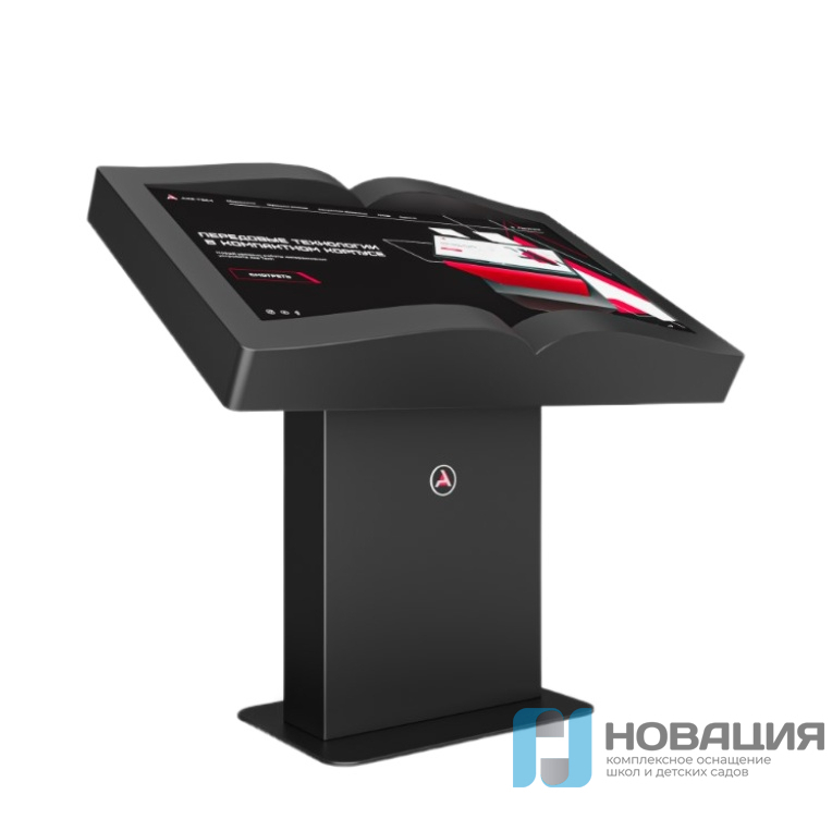 Форм-фактор стола выполнен в виде раскрытой книги. Механическая регулировка дисплея позволит настроить пользователям оптимальный угол для просмотра информации. Оборудование может дополняться информационным приложением или интерактивной книгой с эффектом пролистывания страниц.