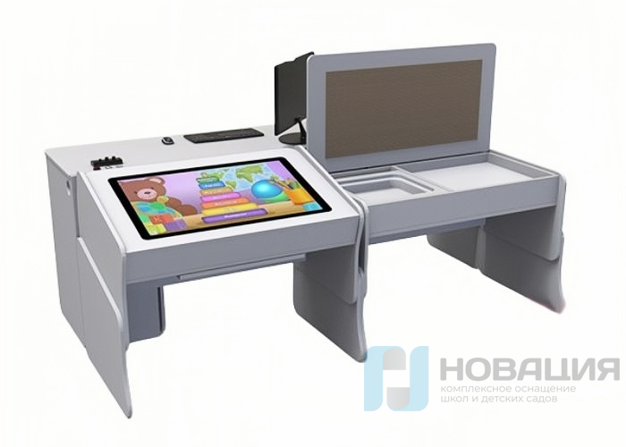 Психолог размещается за отдельным рабочим столом с монитором, дублирующим действия ребенка. Дополнительно имеется модуль с зеркалом для работы по артикуляции и коррекции речи.
