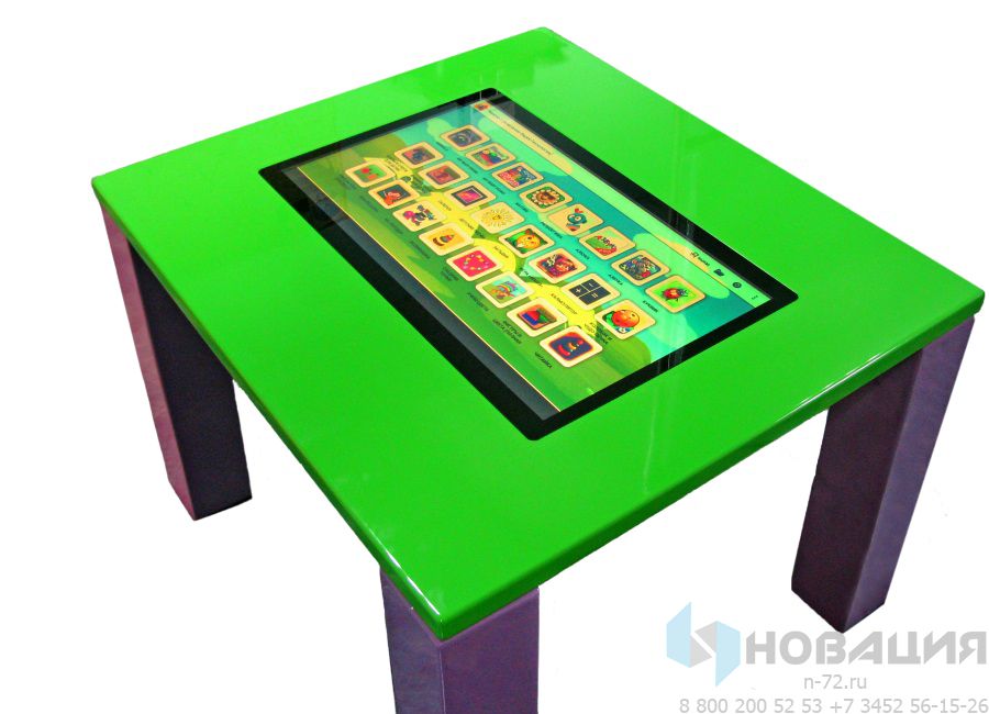 Интерактивный стол представлен сенсорной панелью на прямоугольной столешнице с 4 устойчивыми опорами. Опоры отсоединяются и стол можно вешать на стену.
