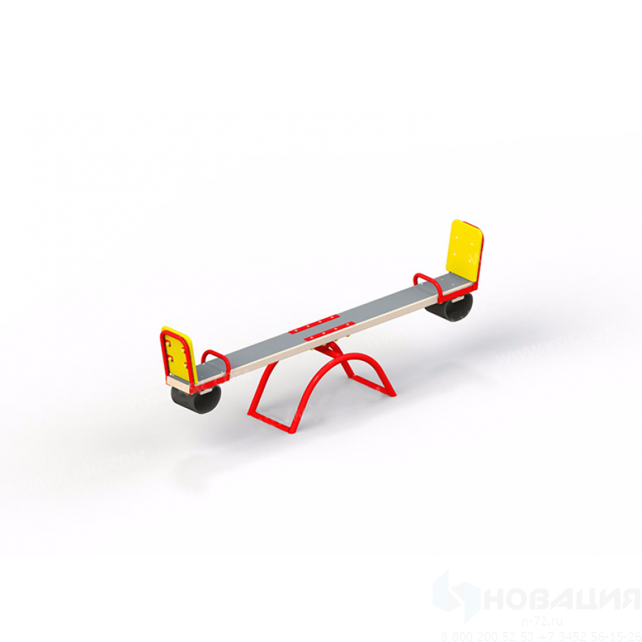 Качель-балансир для 2-х детей опирается на основание из металлических труб (d 42 мм). К доске прикрепляются 2 фанерные спинки, 2 поручня (d 26 мм). На оборотной стороне 2 цилиндра из резины для равновесия.