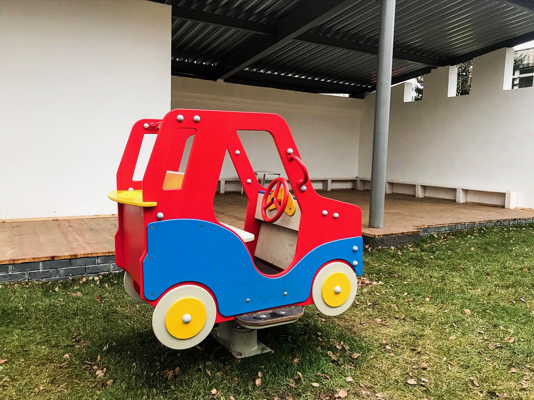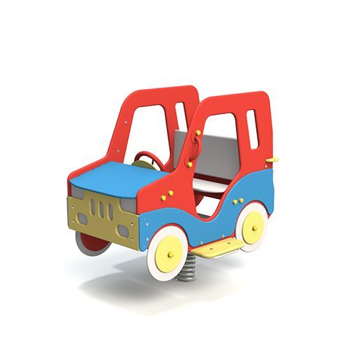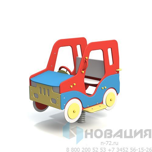 В основании качалки располагаются опорные плиты и цилиндры, между которыми закрепляются 2 оцинкованные пружины. Корпус стилизован под кабину джипа: включает в себя панель с решеткой радиатора, фары, передний и задний бампер, боковые стенки, колеса, руль.