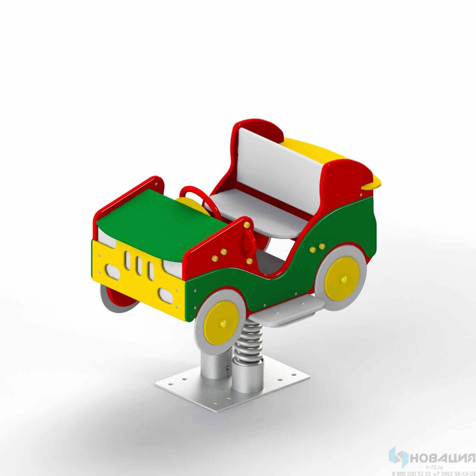 Основание представлено 2 плитами (верхней и нижней) и 2-мя цилиндрами, между которыми закрепляются 2 оцинкованные виброустойчивые пружины. Разноцветный корпус “Кабриолета” образован передним и задним бампером, боковыми стенками, панелью с решеткой радиатора, колесами, фарами. Гладкое сиденье со скругленными углами рассчитано на 2-х человек. Отшлифованная фанера окрашена гипоаллергенным покрытием.