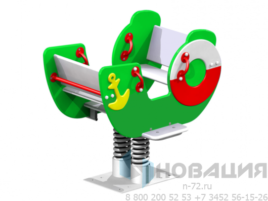 2-х местный балансир оснащен парными элементами: пружинами (d 26 мм), перекладинами жесткости, опорами для ног, фанерными посадочными местами со спинками. В комплексе 8 поручней (d 21 мм). На боковых панелях в виде корабля накладные элементы-якорь, спасательный круг. Для входа предусмотрены выемки в стенках.