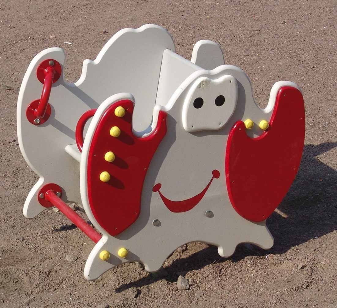Качалка с декоративными элементами оснащена пружиной. Сиденье со спинкой закрепляются между 2-х панелей в виде краба. Для безопасности ребенка предусмотрено 2 поручня (d 21 мм), подставка для ног (d 26 мм). Опорные плиты, раскосы и основание изготовлены из металлических листов (5 мм). Изделие усилено перекладиной жесткости.