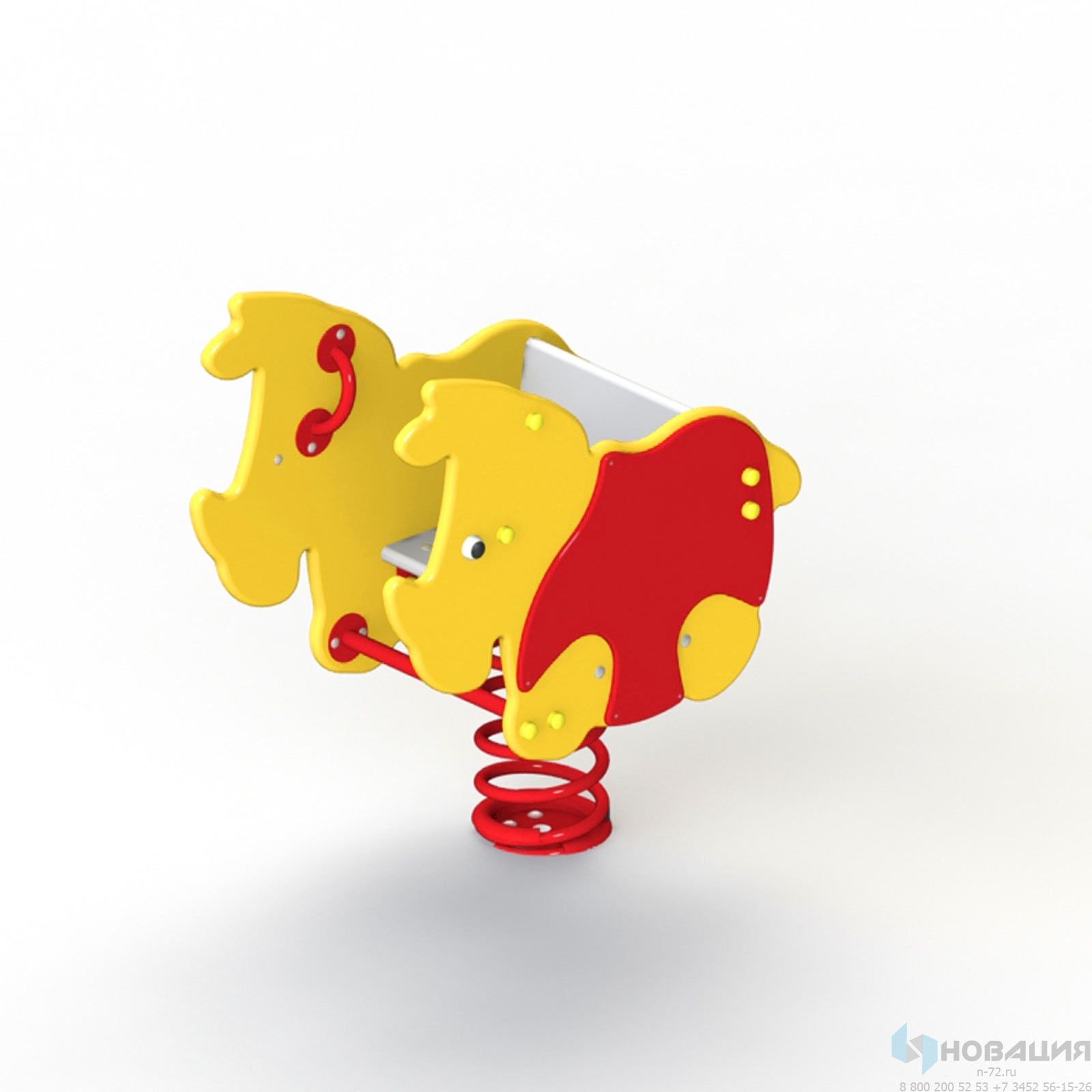 Балансир в форме носорога держится на оцинкованной пружине (d 26 мм) с металлическими плитами. Перекладина жесткости придает установке дополнительную прочность. В корпусе выделены сиденье и спинка. К фигурным панелям монтируются поручни (d 21 мм). Опора для ног металлическая (d 26 мм).