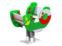 Качалка оснащена ударопрочной пружиной, закрепленной между 2-мя опорными плитами. Сиденье и спинка фанерные. Впереди 2 поручня. Боковые стенки с накладными элементами выполнены в форме петуха. Перекладина жесткости и опора для ног изготовлены из труб (d 26 мм).