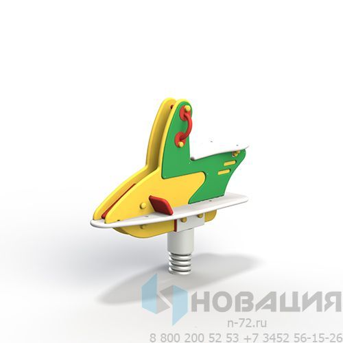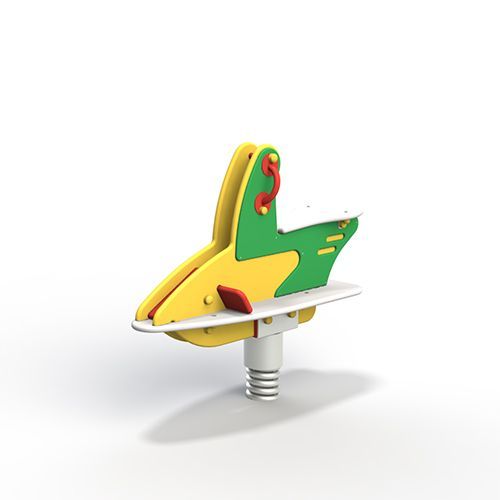 Элемент в форме скутера качается за счет оцинкованной пружины (d 26 мм). 2 металлические плиты позволяют ей прочно закрепляться на месте и удерживать фанерный корпус. Перед сиденьем монтируются поручни (d 21 мм). Внизу есть площадка для ног.