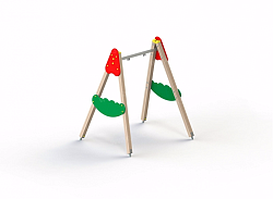 Несущие столбы из деревянного бруса сверху оснащаются пластиковыми заглушками. Металлические подпятники столбов бетонируются в землю. Балка из оцинкованной трубы дополняется креплениями для двух подвесов. Элементы декора оформляются в виде листвы дерева. Фанерные панели отличаются стойкостью к воздействию влаги.