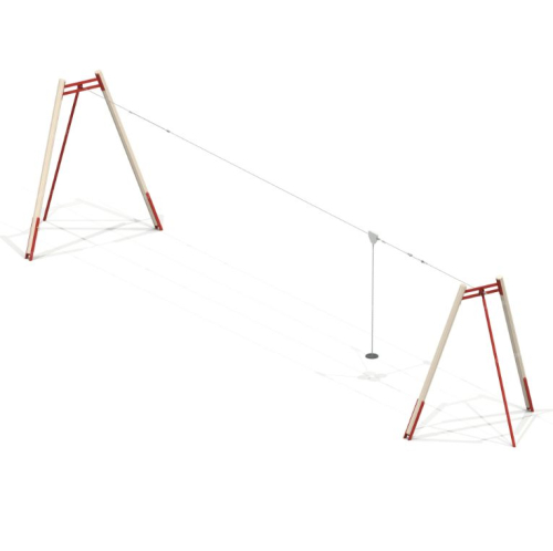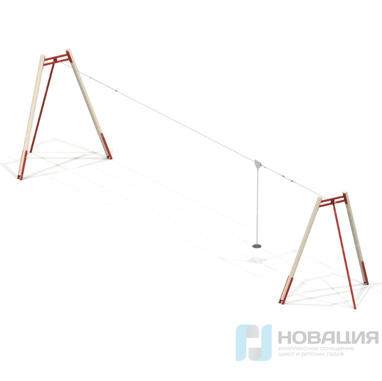 Канатная дорога состоит из троса (d 10 мм), протянутого между опорами, и роликового сиденья на подвесе. Ребенок перемещается по заданной линии во время эстафет, соревнований, физкультурной разминки. Чтобы смягчить движение, с одной стороны предусмотрен отбойник-шина. Каждая из 2-х опор составлена стойками: 1 металлическая, 2 из бруса сечением 136х136 мм.
