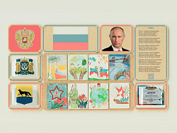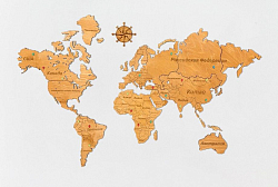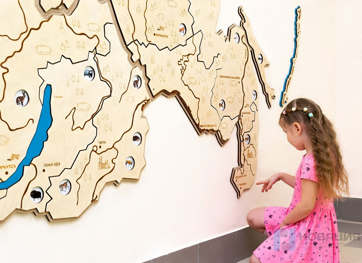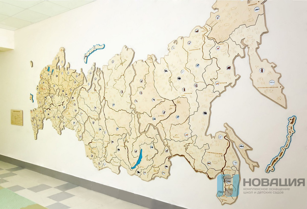 На карте России подписаны города, при помощи лазерной резки обозначены промышленные предприятия. Есть маленькие круглые вставки с изображениями животных, которые обитают в том или ином регионе. При помощи фрезеровки нанесены обозначения рек и гор, а также деление на регионы.