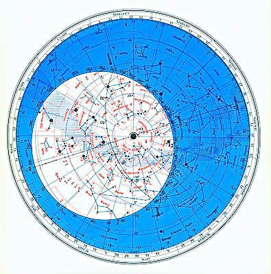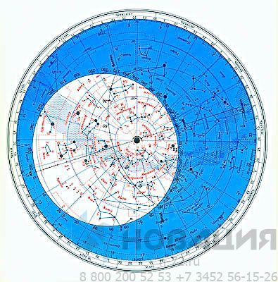 Широкая голубая полоса – Млечный Путь. Границы созвездий показаны пунктирными линиями, сетка экваториальных координат (склонение δ и прямое восхождение α) – голубыми линиями. В центре Северный полюс мира. Окружность, имеющая нулевое склонение, – небесный экватор. Черная овальная линия, пересекающая небесный экватор в двух точках (весеннего и осеннего равноденствия), – эклиптика. Подвижный круг предназначен для изучения суточного и годового изменения вида звездного неба в средних широтах северного полушария Земли (около 50–60° северной широты), а также определения моментов кульминации звезд и Солнца. Контур овального выреза (прозрачной части) на подвижном круге – линия горизонта, на которой отмечены точки юга, севера, запада и востока. Линия, соединяющая точки севера и юга, – неподвижный небесный меридиан.