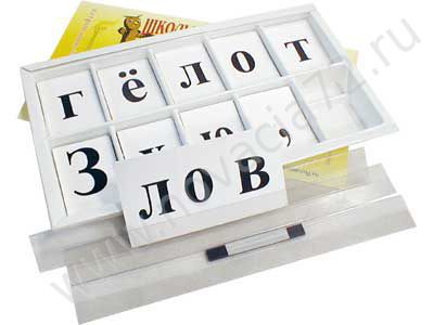 Пособие представляет собой набор карточек, на которых отпечатаны буквы и знаки препинания, уложенные в коробку. В состав пособия входят также и три пластмассовых кармана с магнитами для установки в них карточек для показа новых букв, составления слогов и слов.