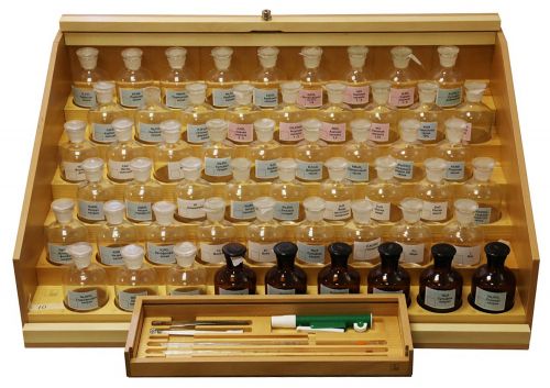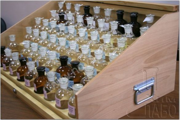 Флаконы объемом 250 мл выполнены из темного (9 шт.) и светлого (45 шт.) стекла, имеют притертые стеклянные крышки и снабжены цветными этикетками. Ячейки под флаконы расположены в шахматном порядке и пронумерованы.