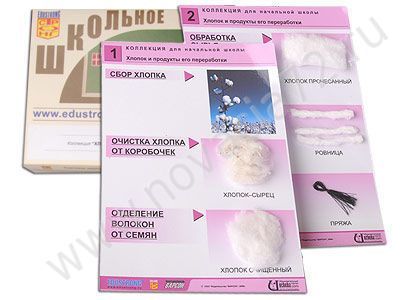 Коллекция поставляется в картонной коробке. Образцы хлопка, пряжи, нитей и тканей размещены на картонных ламинированных планшетах. Сопровождаются краткими пояснениями технологии переработки хлопка.
