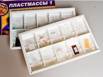Пособие комплектуется руководством по эксплуатации и ламинированным вкладышем, содержащим информацию о свойствах, производстве и применении пластмасс.