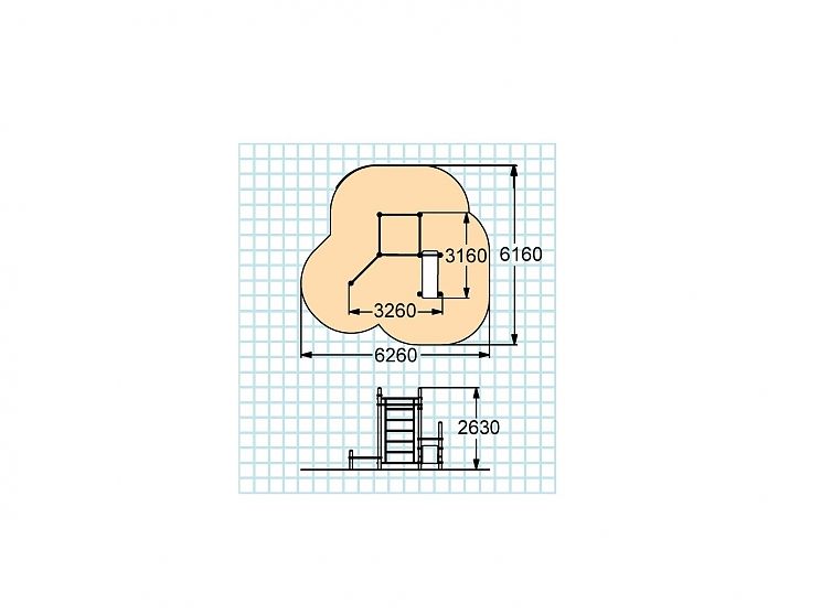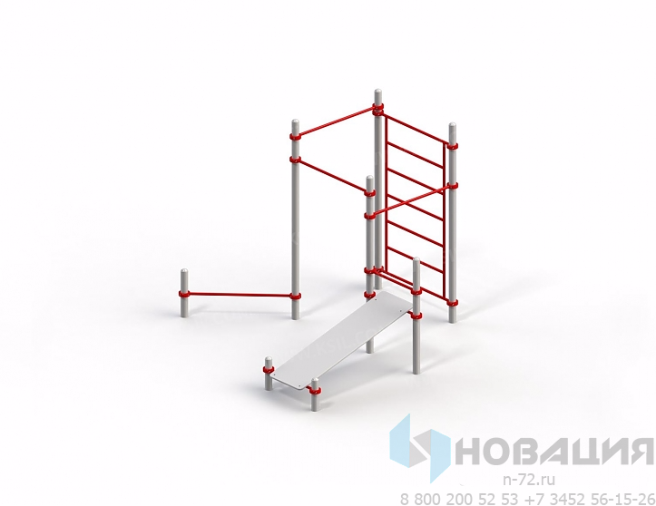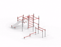 В составе комплекса: 8 несущих стоек, перекладины, шведская стенка, скамья для пресса.