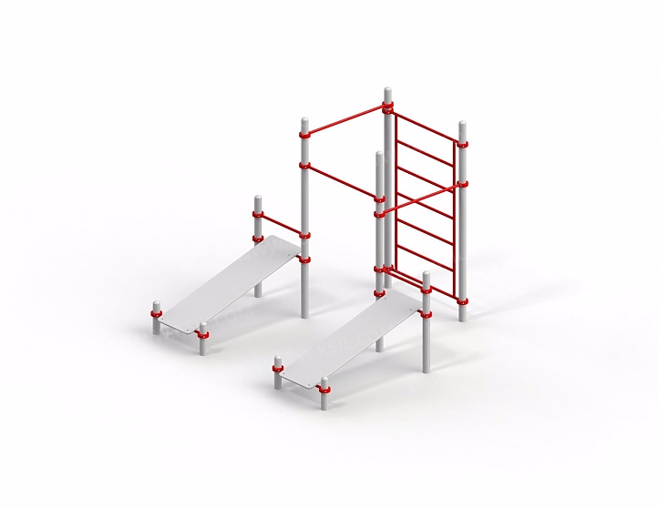 В комплексе 10 разновысоких стоек, 2 скамьи для пресса, разновысокие перекладины, шведская стенка. Это оборудование для тренировки мышц, укрепления позвоночника. Перекладины (d 33 мм) и стойки (d 88 мм) выполнены и металла с гальванизацией.