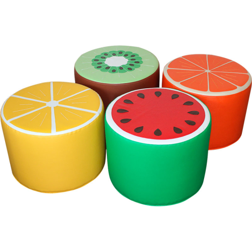 В комплекте 4 игровых пуфика в виде киви, арбуза, лимона и апельсина. Пуфы имеют круглую форму, конструкция безопасна для детей.
