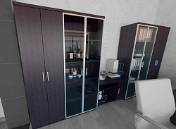 Материалы: ЛДСП (топ 32 мм, стальные элементы 16 мм), ПВХ (кромка 0,45 мм), стекло.
