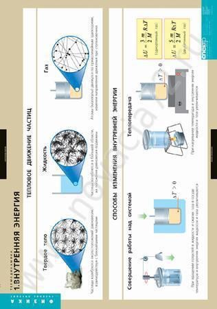 Цветные плакаты для изучения термодинамики соединяются в альбом. Каждая тема представлена на отдельном странице, сопровождается схемами и графиками.