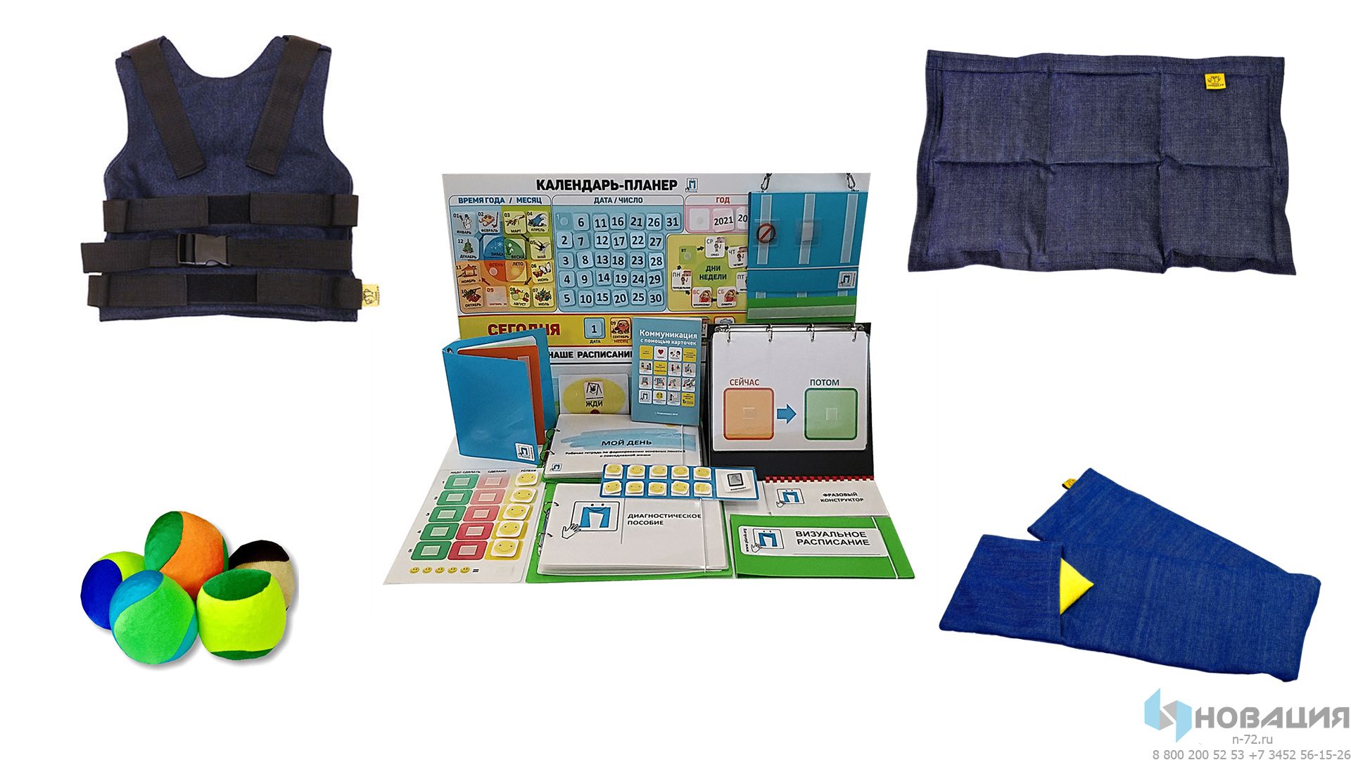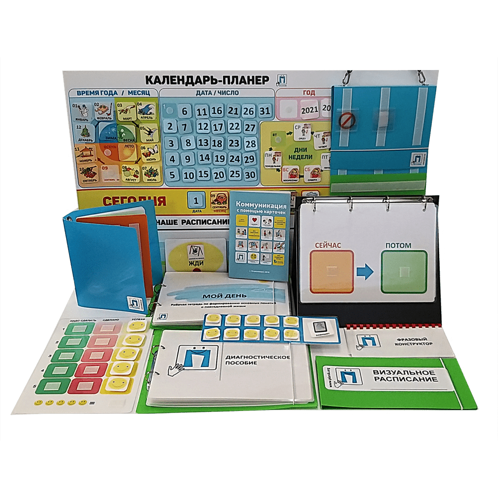 12) тематические пособия (переодевание, конструктор фраз, календарь, набор историй, стартовый набор для коммуникаций и др.),