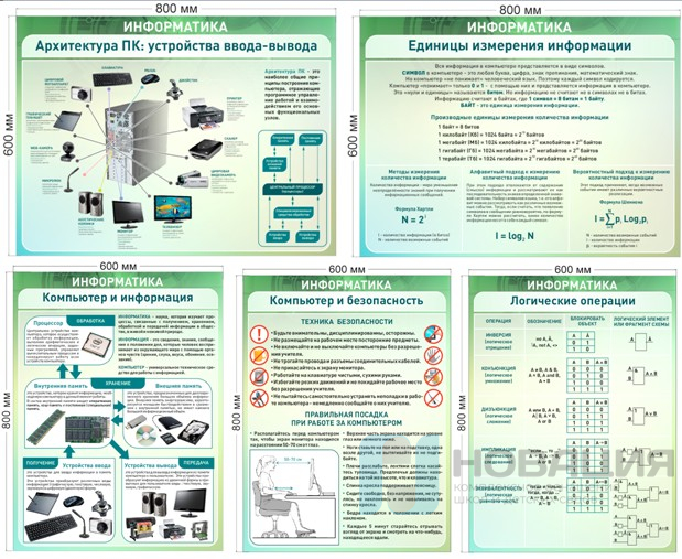 Набор из 5-ти стендов с полноцветной печатью размещается в кабинете информатики. Надписью наверху каждой доски отмечена тематическая принадлежность комплекта.