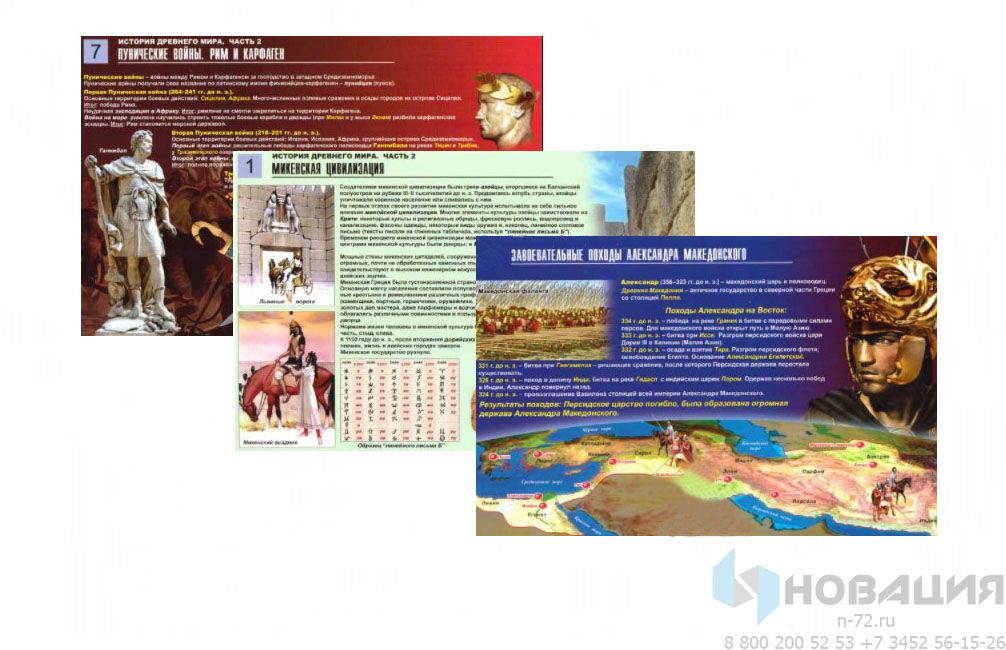 Набор полноцветных раздаточных материалов производится типографским способом, на плотной бумаге, применяется на втором этапе изучения истории древнего мира. В комплект наглядных таблиц для кабинета истории входят пособия с иллюстрациями и статьями на тему: