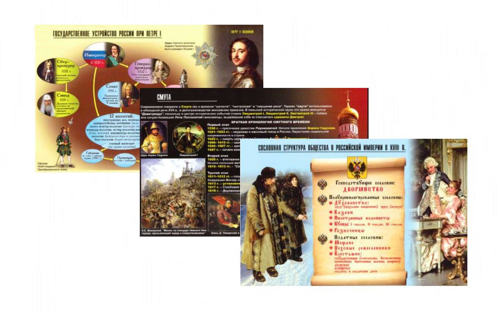 Комплект полноцветных раздаточных таблиц производится типографским способом, на плотной бумаге. Наглядные материалы для кабинета истории представлены иллюстрациями и статьями на тему:
