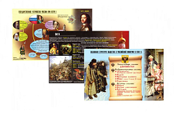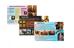 Набор полноцветных раздаточных таблиц производится типографским способом, на плотной бумаге. Наглядные материалы для кабинета истории представлены иллюстрациями и статьями на тему: