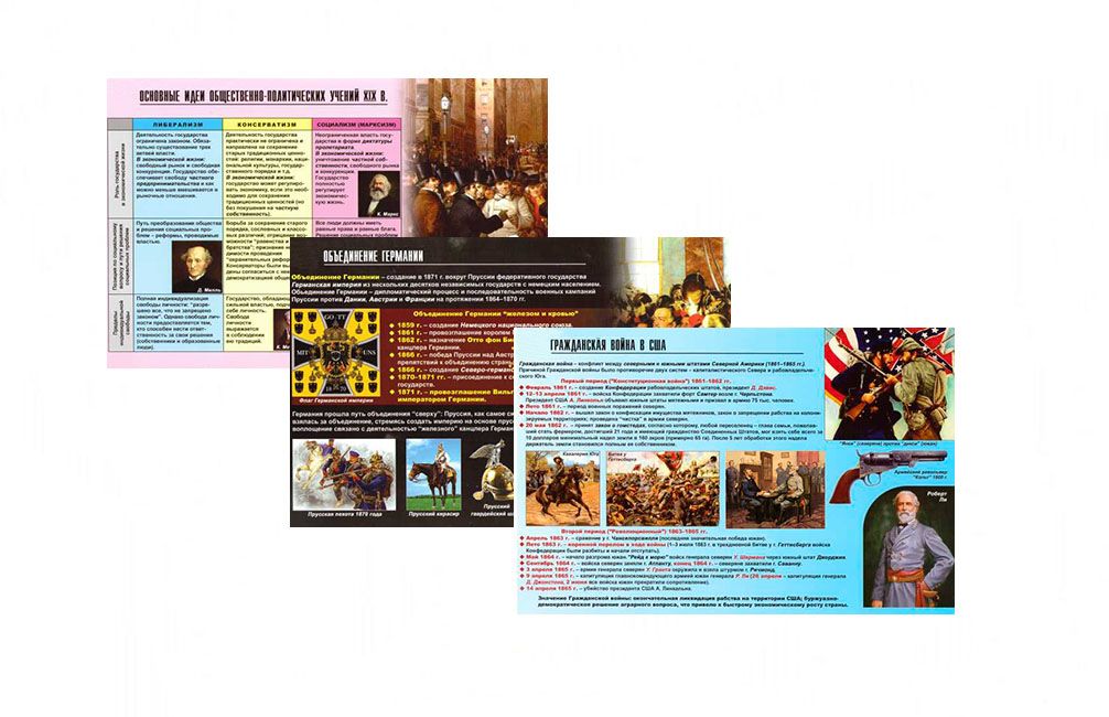 Набор таблиц производится типографским способом, на плотной бумаге с полноцветной печатью. Раздаточные материалы для кабинета истории представлены иллюстрациями и статьями на тему: