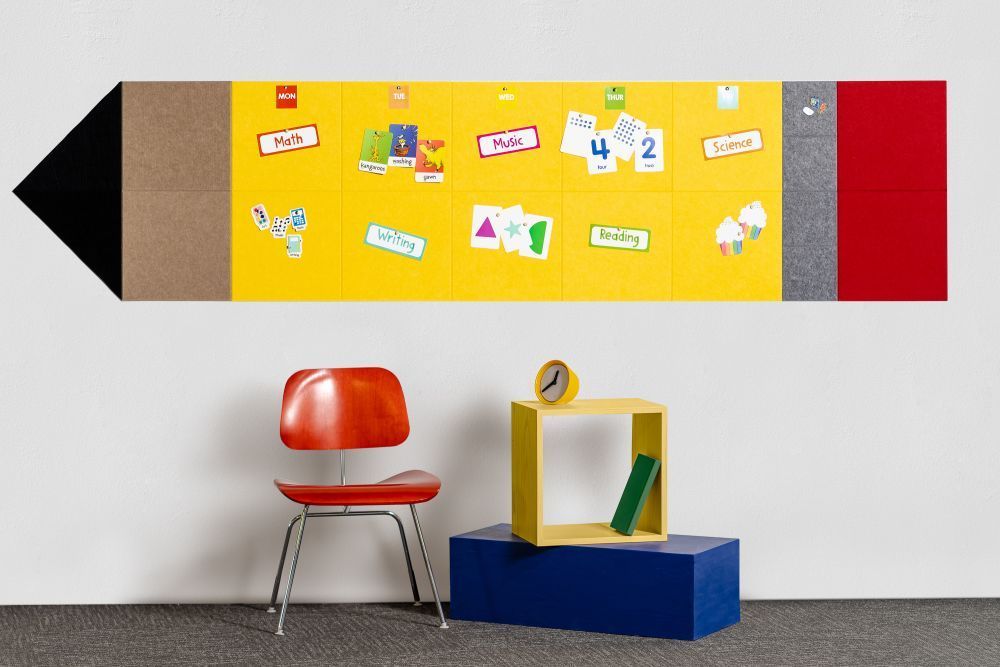 На фигурном поле размещают карточки, таблички, графики или фотоотчеты. Это альтернатива пробковой доске. Для фиксации бумаги подойдут прищепки с липкой стороной или кнопки.
