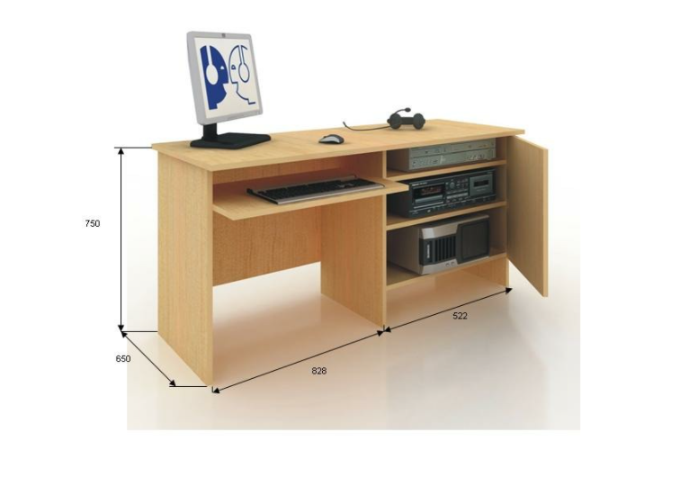 - Компьютерный стол (ЛДСП (16 мм), цвет бук, размеры (ШхГхВ): 1000х600х750 мм). Точка подключения LAN, точка питания (220 В).