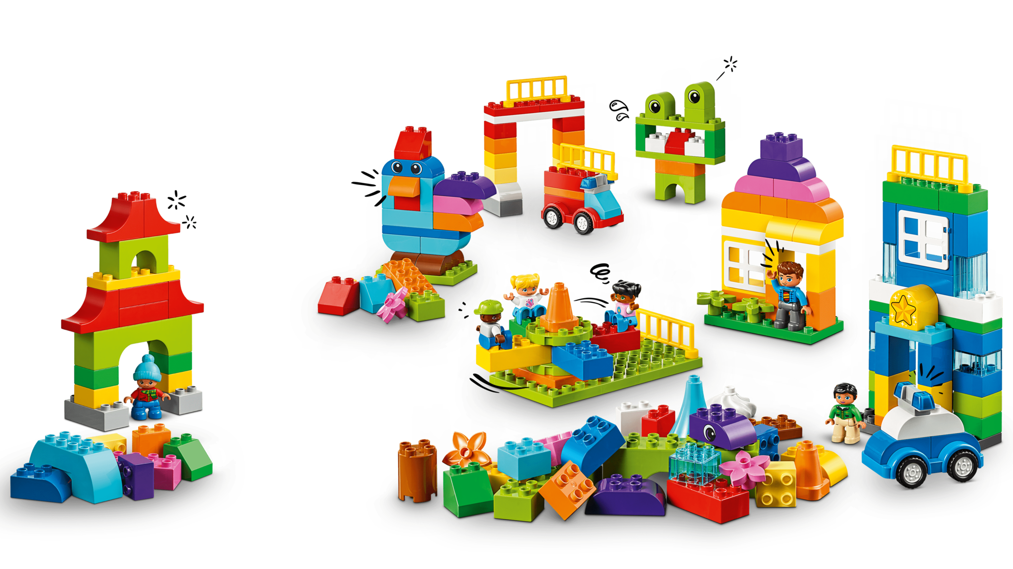 В комплекте 480 различных деталей (кубики, фигурки, колёсные шасси, окна, двери, строительные пластины LEGO DUPLO) и 10 карточек с идеями по сборке. С их помощью ребята индивидуально или в группах смогут создать огромное количество различных моделей: дом, ресторан, автобусная остановка, больница и пожарная станция, самолёт, автомобиль, подводную лодка и многое другое.
